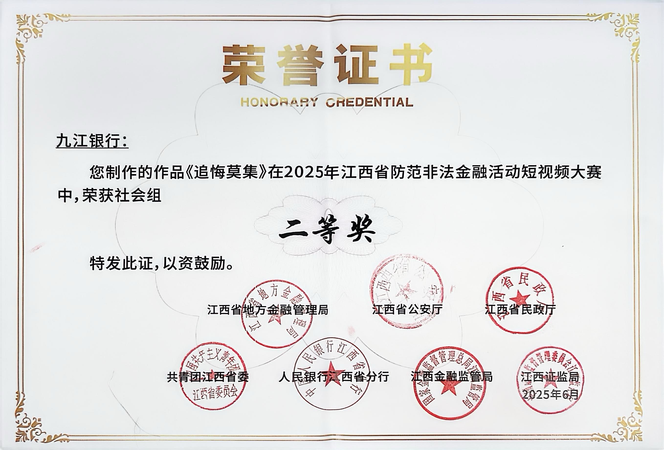 6月13日,以“守住錢袋子·護好幸福家”為主題的2025年江西省防范非法金融活動集中宣傳月啟動儀式在南昌隆重舉行。活動現場對“2025年江西省防范非法金融活動短視頻大賽”獲獎作品進行了表彰,九江銀行憑借其貼近生活、創意新穎的參賽作品——《追悔莫集》,從眾多參賽單位中脫穎而出,榮獲大賽二等獎。