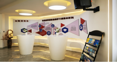 (四)金融消保區:整面定制廣告造型,以白+紅+藍的顏色呈現,暗藏燈帶,介紹金融消費者八項基本權利:財產安全權、知情權、自主選擇權、公平交易權、依法求償權、受尊重權、受教育權、信息安全權。