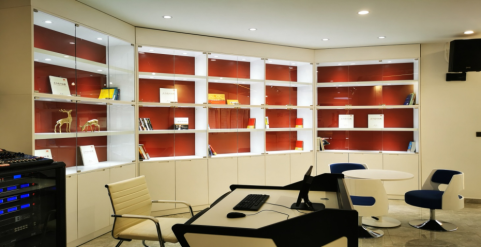 (六)互動交流/意見征集區:整面定制柜體,以白+紅的顏色呈現,用于展示相關金融物品,例如宣傳手冊、金融書籍等。同時放置沙發用于討論交流,提出意見及建議。