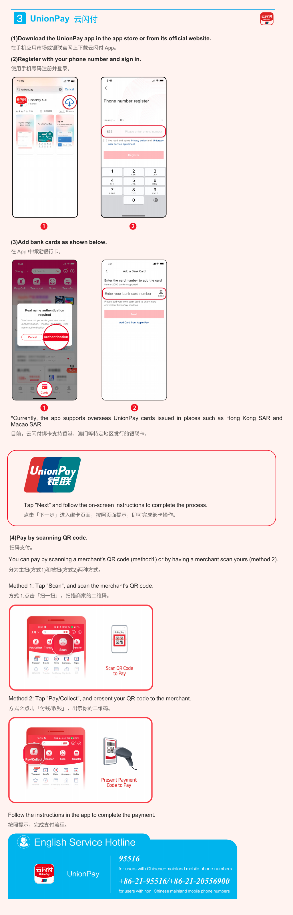 只需一部手機(jī),就可以使用便捷的支付服務(wù)。我們提供支付寶、微信支付、云閃付等多種支付產(chǎn)品,您可自行選擇。為了便利您更好地使用移動(dòng)支付產(chǎn)品,一定金額以下的交易免于采集身份信息。快來(lái)體驗(yàn)吧!請(qǐng)?jiān)L問 www.pcac.org.cn 觀看操作視頻了解更詳細(xì)信息。